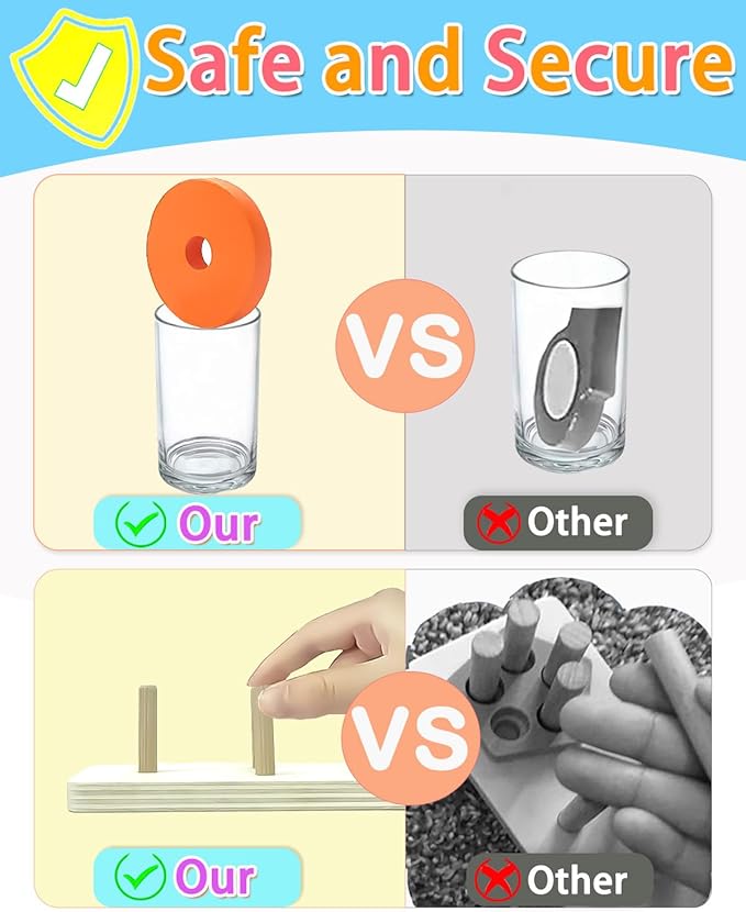- 【Safety and High Quality】 Montessori toys for 1 2 year old are smooth.These blocks are not only covered with smooth non-toxic paint, as safe as food,but odorless and anti-fade, which keeps our 1 2 years old boys and girls play with safely.This toddler learning toys include high-quality, chunky wooden pieces to ensure tiny hands easily grasp the pieces and complete the stacking puzzles. Kids will love the large, thick pieces of this toddler toy, which are easy to handle and put together.