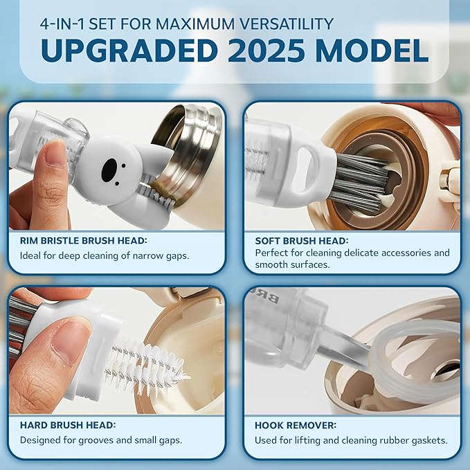 - 【REACHING WHERE OTHERS CAN'T – A BRUSH THAT UNDERSTANDS】Not all brushes are created equal. These aren’t just gadgets; they’re your allies against stubborn grime. With heads that slip into straw holes, curl into bottle lids, and slide into rubber seals, this set becomes your invisible hand, cleaning gently yet completely.