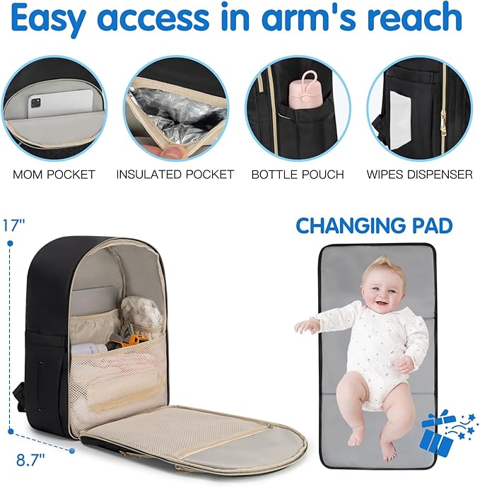 - Ample & Well-Organized Storage - Measuring 12.6" L x 8.7" W x 17" H, with 13 pockets in total for baby stuff, including 2 side pockets for tissue and bottle, 4 internal pocket, an internal mesh pocket and 2 insulated pockets; Spacious enough to carry baby essentials in this diaper backpack