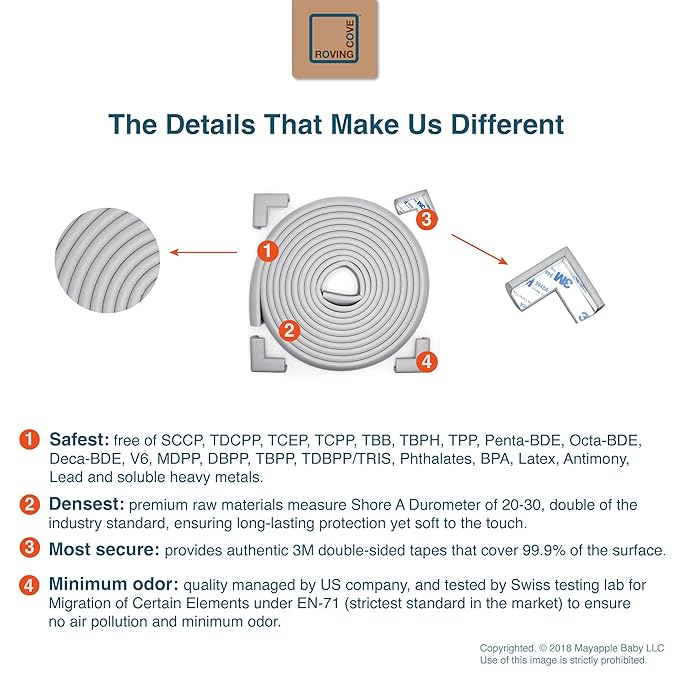 - CLEAN SAFETY: Roving Cove uses safe and pure raw material and was the first brand to make foam safety bumpers without the use of toxic flame-retardant chemicals (SCCPs). Our edge corner guards contain no BPA, no phthalates, no heavy metals, no latex, no SCCPs. Inherently flame-resistant; passed flammability tests under US regulations.