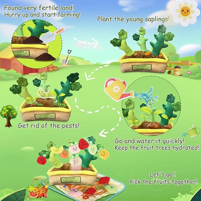 - đăFruit Tree Sensory Toyă This fruit tree is filled with fascinating elements, including fruit sounders, bells, fruit number charts, a soft touch on the fruit surface, and each fruit can be attached to the tree at any time or removed. Let your baby play, explore and grow. Each time you pull or stick, make the game time full of fun!