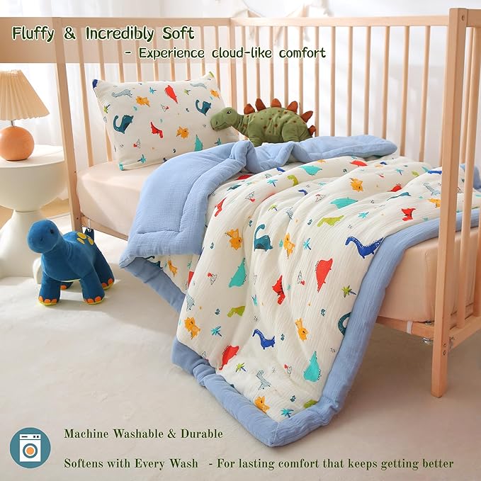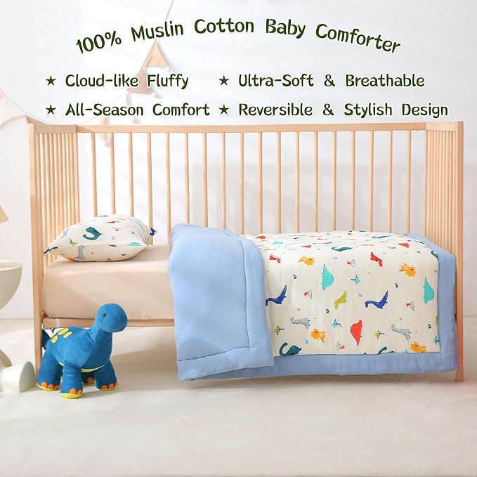 - COMFORTABLE FABRIC & FILLING: The outer layer is made from double-layer cotton muslin fabric—soft, breathable, and ideal for delicate skin. It’s durable, resistant to fading and pilling, and becomes even softer over time. Filled with a down-alternative blend that includes 20% soy fiber, this crib comforter offers just the right weight to help keep your baby comfortable throughout the year