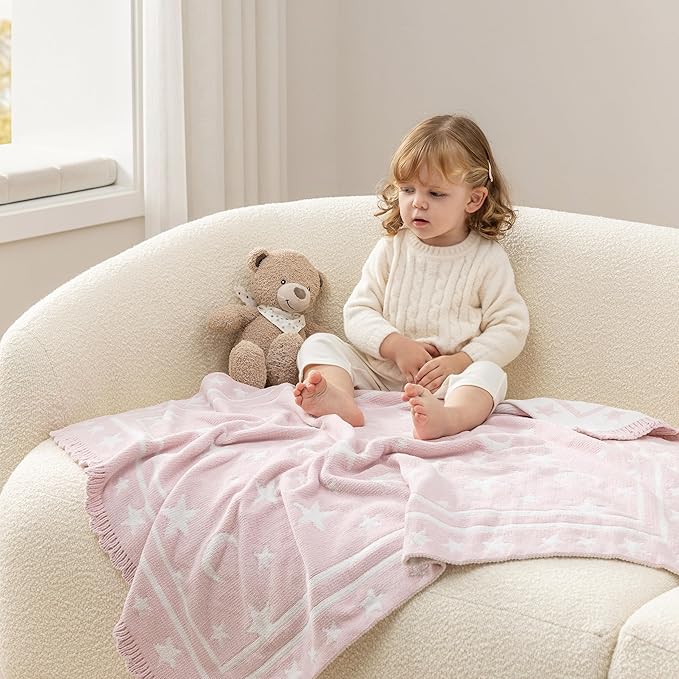 Berkshire Baby Blanket,Ultra-Plush Reversible Chenille Knit Toddler Blanket,Cute Pattern Nursery Crib Blanket,Ideal Baby Gift(30x40 Inches,Stars and Moon Border White-Pink)