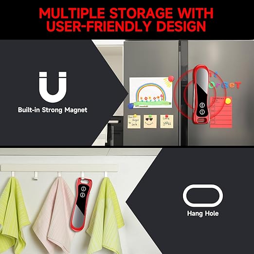 - PORTABLE & USER-FRIENDLY DESIGN: The Ideal design is that there is a strong MAGNET on the back of the food thermometer that makes it easy to just stick to the grill/fridge for safe-keeping. Large hang loop design makes more convenient to store this thermometer in the kitchen anywhere. A free screwdriver for opening the battery compartment and if you drop it the door isn't going to pop off.