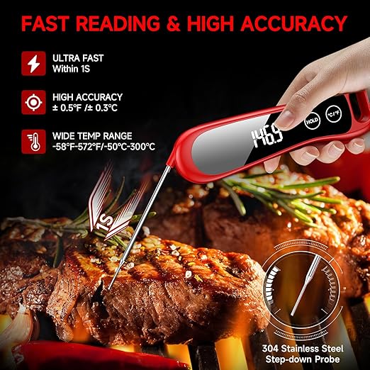 - 1-SECOND ULTRA-FAST READING & ±0.5°F HIGH ACCURACY: Choose Tegnat, Say Goodbye to the Undercooked Food!!! Our instant read meat thermometer features precision sensor and 1.7mm diameter sensitive probe, which can take temperature in a little as 1S and features an improved accuracy spec of ± 0.5°F (± 0.3°C) with a wide range of -58℉-572℉/-50°C-300°C, taking the guesswork out of your cooking.