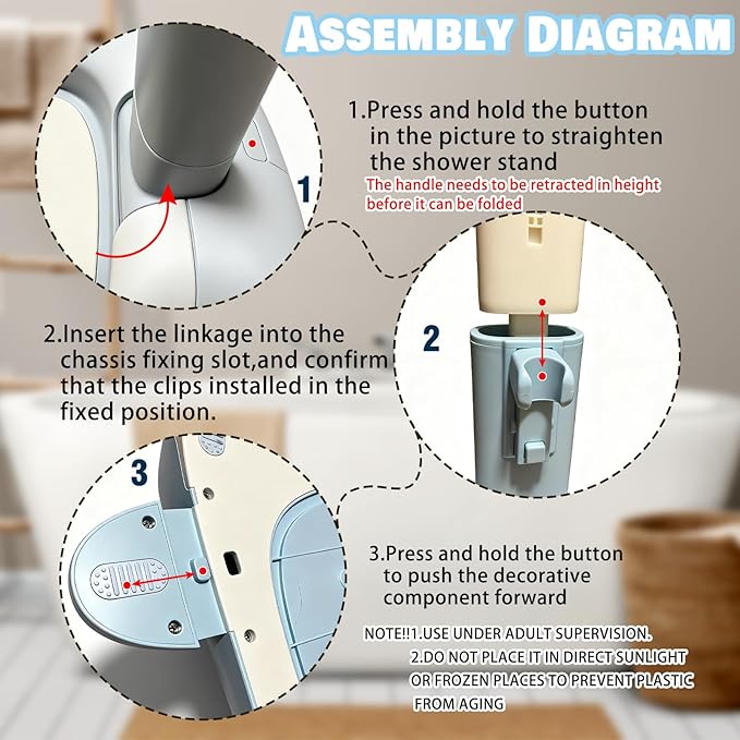 - 【Interactive Features】The baby standing bath stand features cartoon animal patterns and sounds to attract baby's attention, making bathing easier! It also features snaps on the side for placing the shower head, freeing up mom's hands. After the bath, this thoughtfully designed stand folds into a compact size for easy storage and portability.