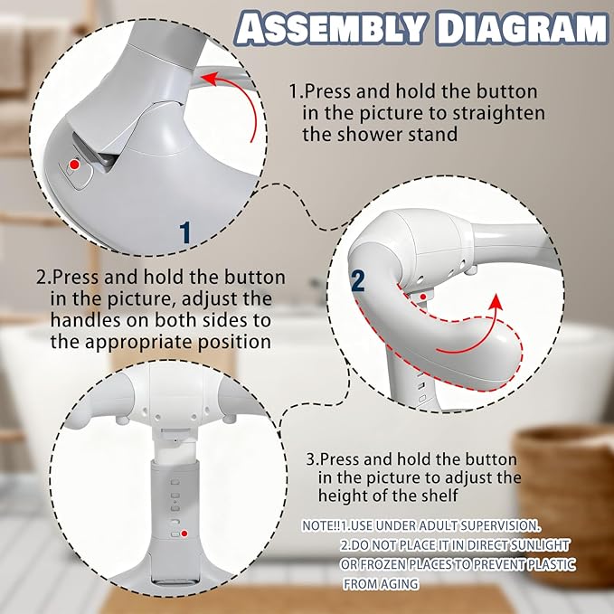 - 【Ergonomic Design】Made of high-quality ABS material, the adjustable handle provides firm support and conforms to the natural curve of the baby's back and waist, ensuring comfort during bathing. This versatile shower stand can be used in a variety of places, including the bathroom, for bathing, diaper changing, and applying lotions and creams.