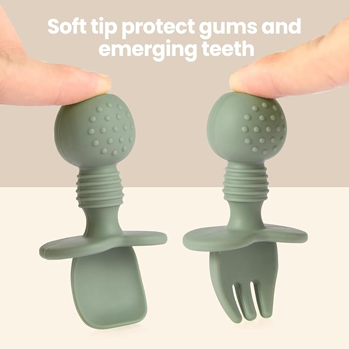 - Baby Weaning Spoons: Ergonomic silicone baby forks and spoons set designed for baby's small hands, short and round handles for easy grip, making it easier for babies to self-feed. The soft chew able spoon and fork are gentle on delicate gums and help baby develop fine motor skills and independence.