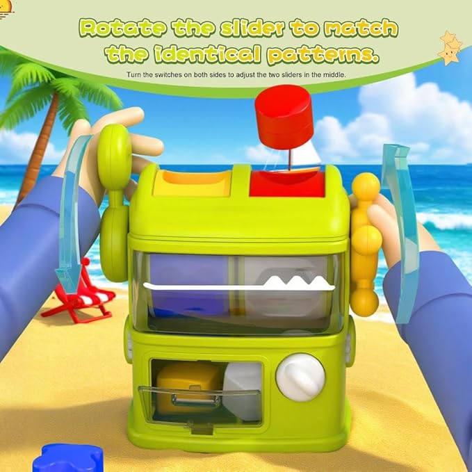 - 【Interactive Play & Repeat Fun】Kids will love pulling the lever or turning the steering wheel to watch the shapes drop into the compartment below. They can then open the flip-top lid by twisting the knob, retrieve the blocks, and start the sorting adventure all over again!