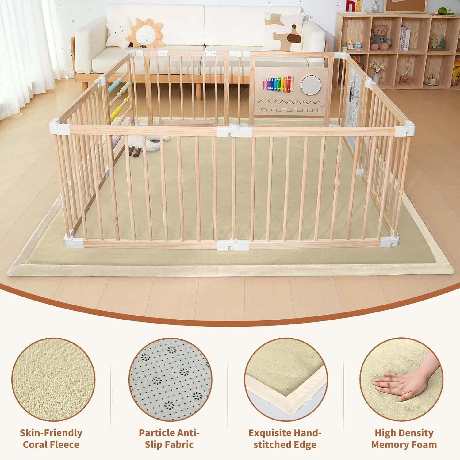 - 【All-Purpose Baby Mat】Featuring a memory foam core, this baby rug is soft, foldable, and versatile. Use it as a travel play mat, a tent mat for kids, or an area rug. Suitable for both indoor and outdoor use, this playpen mat is durable, fade-resistant, tear-resistant, and equipped with non-slip dots on the bottom to prevent slipping