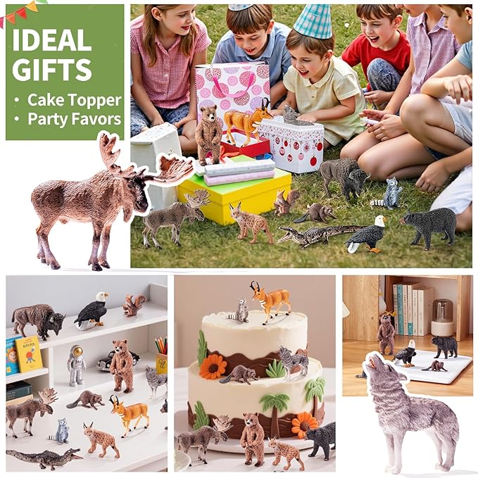 - 12PCS Large Woodland Animal Figures: This set of North American Animal Toys for Kids includes crocodile, black bear, grizzly bear, gray wolf, bison, moose, pronghorn, bobcat, beaver, raccoon, bald eagle, squirrel. Each one is designed to look just like real wildlife!