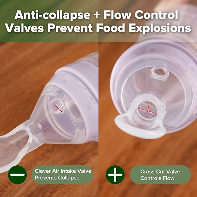 - πππππππππ ππππππ π ππ ππππ πππππππ:The innovative valve of this baby bottle spoon feeder allows air intake for quick rebound after each squeeze, while the ergonomic shape enables precise food flow control, every feeding comfortable and effortless.