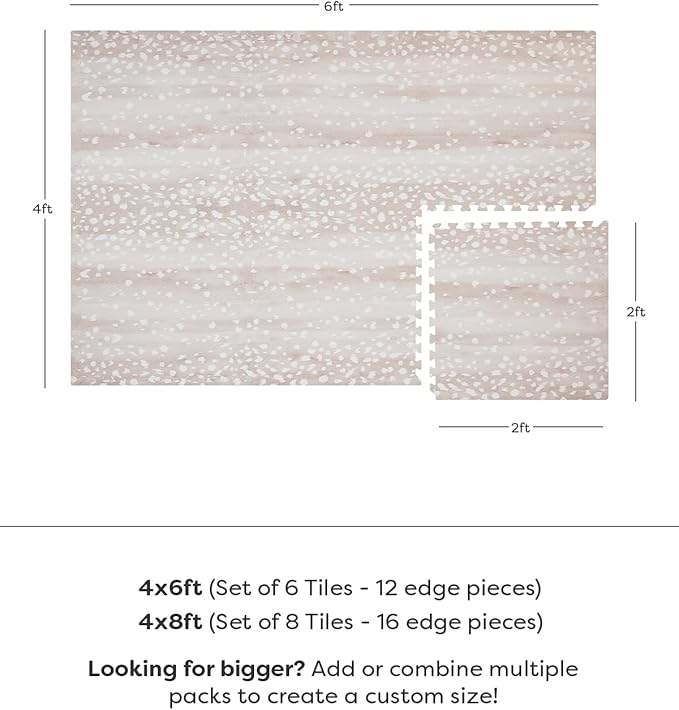 - INTERLOCKING FOAM TILES FOR EASY SETUP - Our play mats arrive in a set of 6 tiles. Designed with modular interlocking foam, our kids play mats connect easily like a puzzle perfect for quick assembly, rearrangement, or storage. Each 24.8” x 24.8” tile is 0.47" thick and comes with edge pieces to create a seamless, rug-like finish that looks great in any space. Perfect for growing play areas or multi-room use.