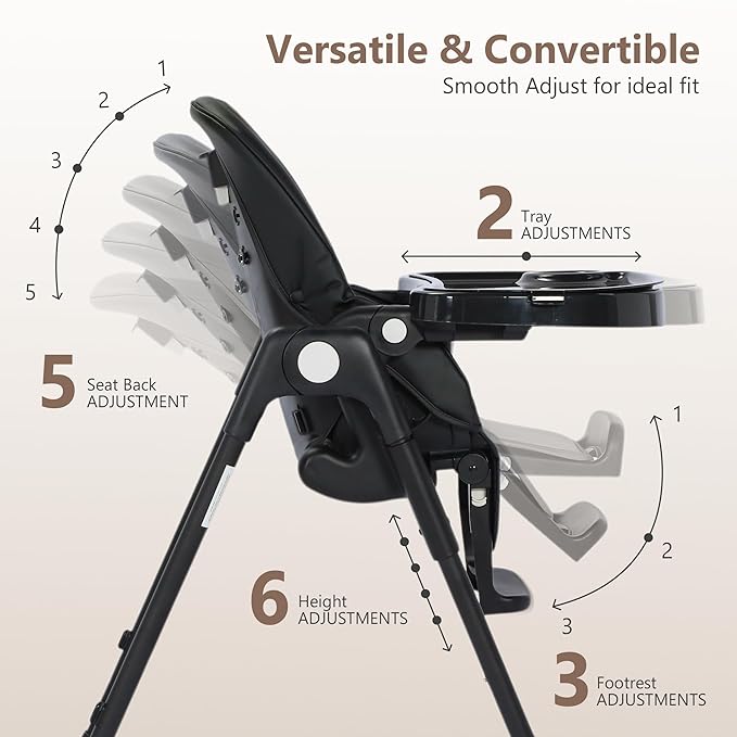 - Multifunctional High Chair: It can be converted to a Infant highchair, baby feeding chair, toddler high chair and child seat or more; Meet your various needs: 6 position height, 5 seat recline positions, 3 footrest positions, 2 tray positions