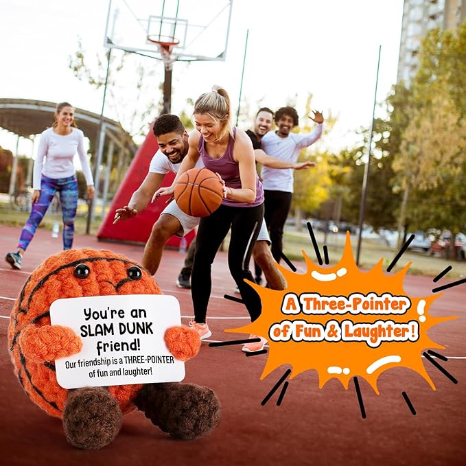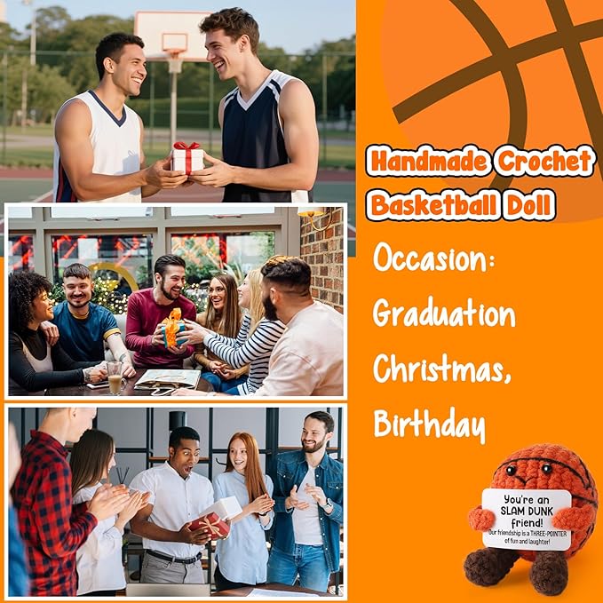 - 【HANDMADE CROCHET BASKETBALL】: This 3.15x2.4x2.55-inch knitted basketball stuffed animal combines sporty charm with plush softness. The information on this card is“ You're an slam dunk friend! Our friendship is a three-pointer of fun and laughter!”