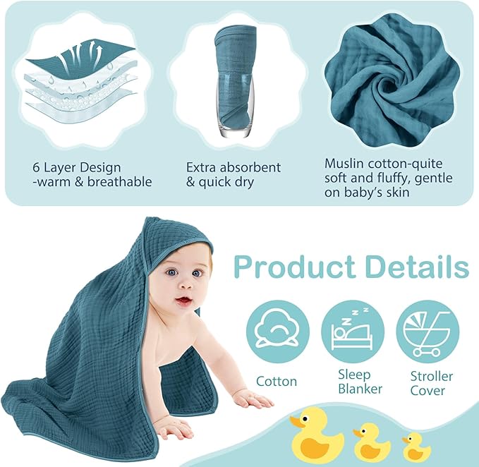 - Thoughtful Design: each muslin baby hooded towels features 6 layers, thick enough to quickly absorb moisture from the skin, keeping your baby dry and comfortable, providing a soft using experience after baths