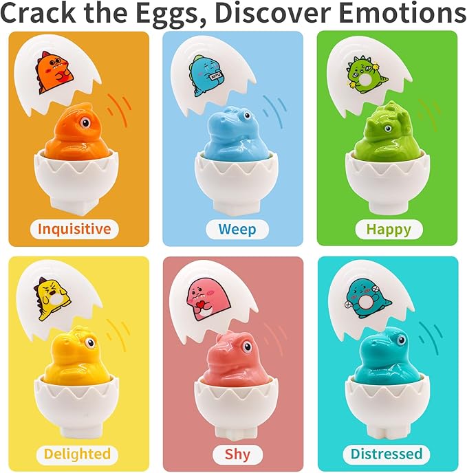 - Crack the Dinosaur Eggs, Discover Emotions: Includes 6 adorable dinosaur eggs with dinosaurs inside, each showing a different emotion—Inquisitive, Weep, Happy, Delighted, Shy, and Distressed. Kids love cracking open each shell to reveal a baby dino, learning to recognize emotions, colors, and expressions through fun pretend play.