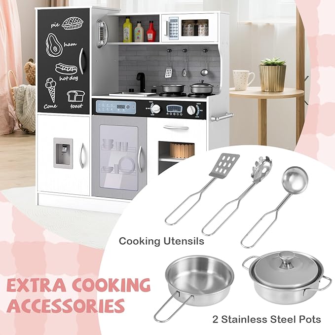 - 【With A Chalkboard】: Equipped with a chalkboard and chalk, the play kitchen toy set will encourage kids to list their menus or paint some cute patterns, thus making the cooking space more joyful. The interesting design allows kids to express themselves while engaging in kitchen activities.