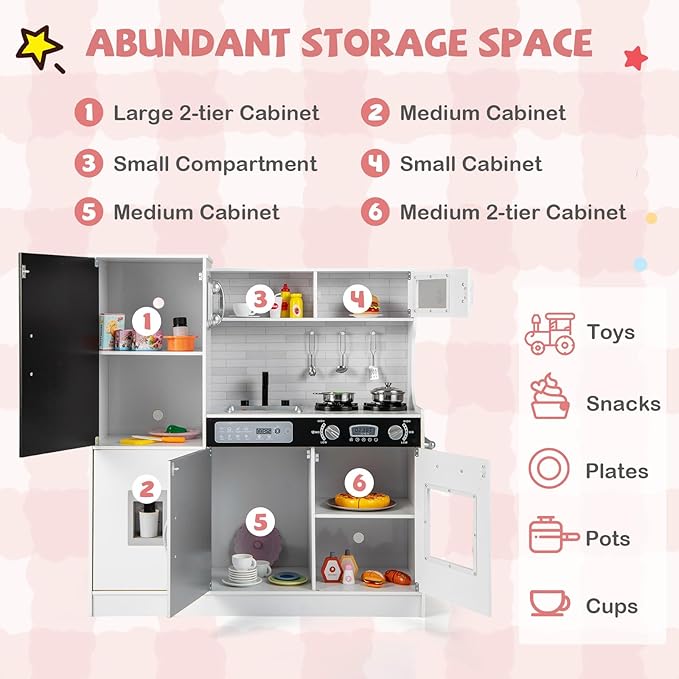 - 【Abundant Storage Space】: Equipped with a large 2-tier cabinet, 2 medium cabinets, a small compartment, a small cabinet, a medium 2-tier cabinet a towel rack and 3 hooks, the pretend play kitchen with roomy space will keep kids snacks, cups, toys and books in organized, creating a clean space.