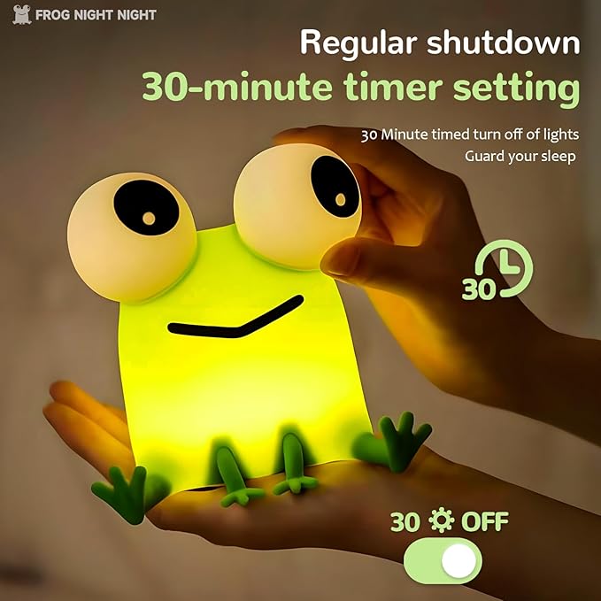 - Timer Control: When children need the company of soft light to dispel their fear of the dark, simply slide the bottom button of the frog lamp to "30" to set a 30-minute timer to off, providing a sense of security