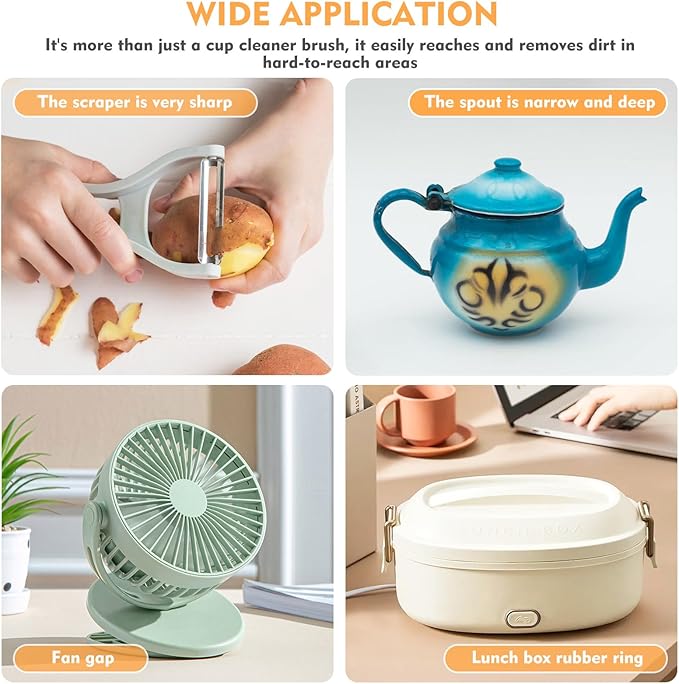 - [ Wide Application ] The 3 in 1 lid cleaning brush is suitable for all kinds of bottles and cups, such as stainless steel cups, glass cups, coffee cups, tea cups, sports cups, wine glasses, beakers, kettles, pacifiers, baby bottles. In addition, It effectively cleans residue from paring knives and juicers