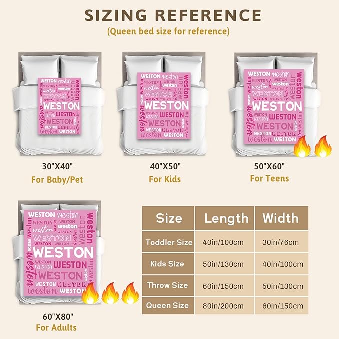- Multiple Sizes: Personalized name blanket 30"x 40" is perfect for newborn swaddle baby.Custom blanket with name 40"x 50" is for child kids. Custom name blanket 50"x 60" is great for teen-agers.Customized blanket 60"x 80" is huge, excellent for any adult. Who love to ensconce themselves in the warmth of the blanket.