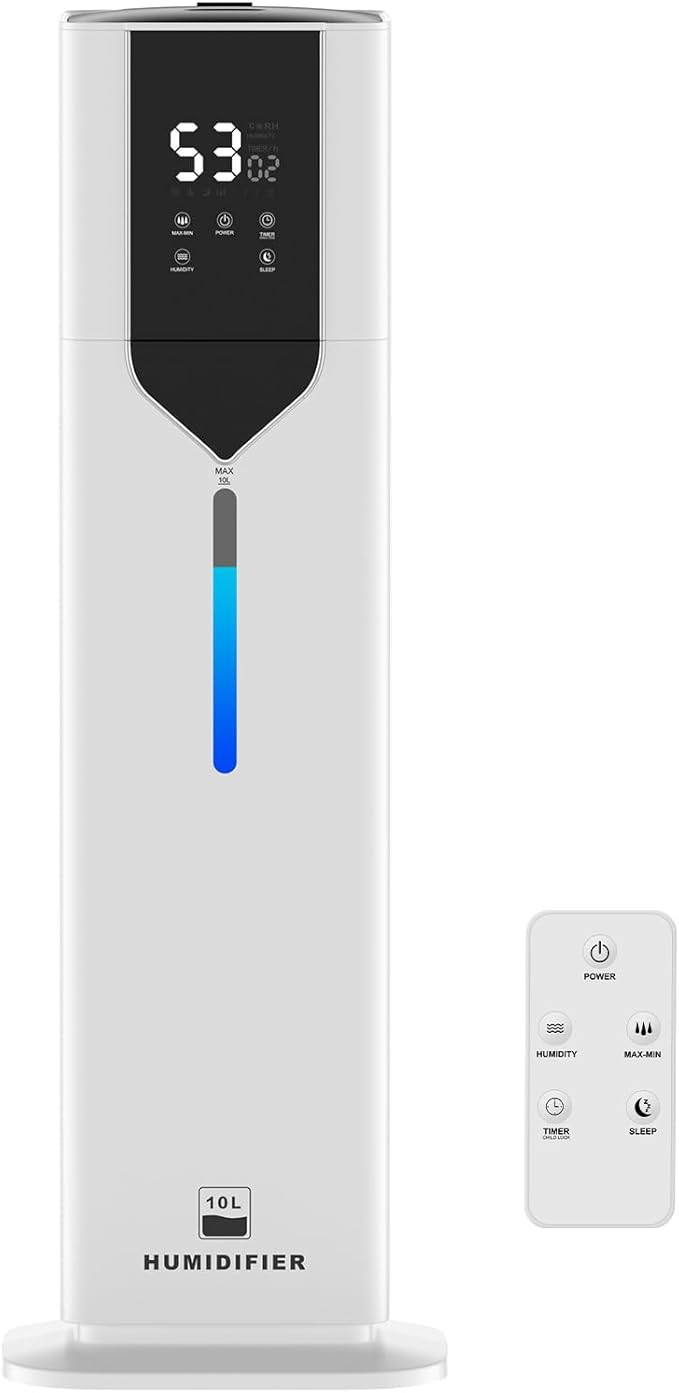 - Humidifiers For Large Spaces: Featuring a removable 10L water tank, this large humidifier delivers powerful mist output, enabling continuous operation for up to 100 hours on a single refill and covering an area of 600 square feet. The convenient top-fill lid simplifies refilling, and the 360° rotating nozzle lets you adjust the spray direction as needed.