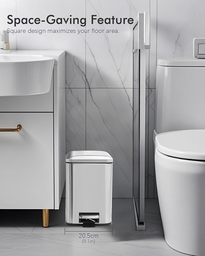 - 1.6 Gallon Bathroom Trash Can: This small trash can features a space-efficient square design that fits perfectly into bathroom corners, vanities, or beside your toilet, maximizing your space effortlessly.