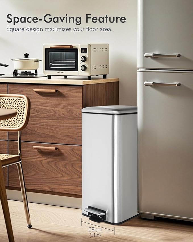 - HANDS-FREE FOOT PEDAL & SOFT-CLOSE LID: Open the trash can lid effortlessly with the foot pedal to maintain hygiene and avoid germs. The innovative soft-close mechanism closes the lid quietly and gently, reducing noise and enhancing product durability.