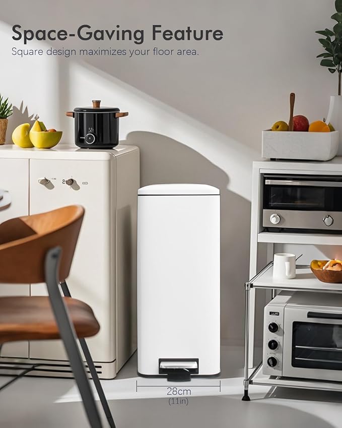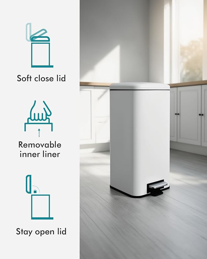 - HANDS-FREE FOOT PEDAL & SOFT-CLOSE LID: Open the trash can lid effortlessly with the foot pedal to maintain hygiene and avoid germs. The innovative soft-close mechanism closes the lid quietly and gently, reducing noise and enhancing product durability.