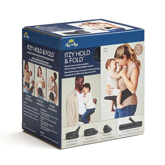 - The Itzy Hold & Fold hip seat baby carrier features a compact design, three carrying positions and an included zipper pocket for essentials
