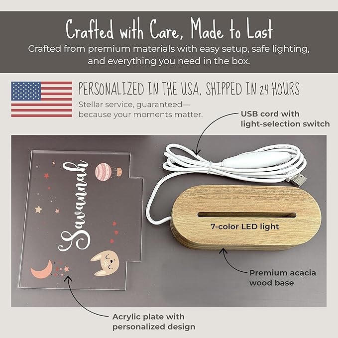 - Safe, Durable & Made with Care: Crafted from smooth acrylic and solid acacia wood, this customized baby night light is powered by a USB cord and personalized right here in the USA—backed by our commitment to quality and stellar customer service