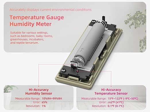 - [HIGHER-PRECISION SENSOR] -- With advanced high-precision temperature and humidity sensors, it accurately displays current environmental conditions, making it suitable for various settings such as bedrooms, baby rooms, greenhouses, incubators, and reptile terrarium.