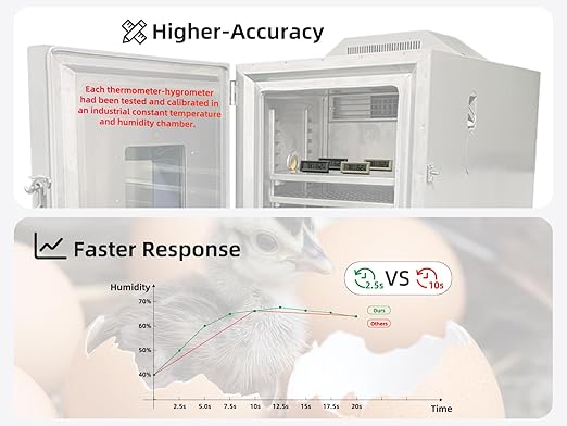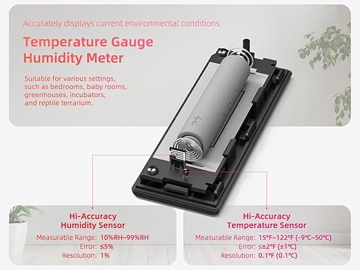 - [HIGHER-PRECISION SENSOR] -- With advanced high-precision temperature and humidity sensors, it accurately displays current environmental conditions, making it suitable for various settings such as bedrooms, baby rooms, greenhouses, incubators, and reptile terrarium.