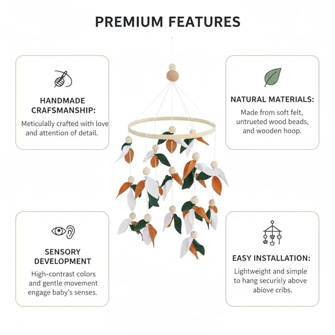 - Stimulate your baby's visual development with our high-contrast leaf mobile, designed to captivate curiosity and promote color recognition in a minimalist woodland style.