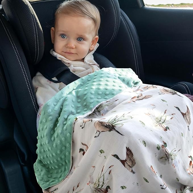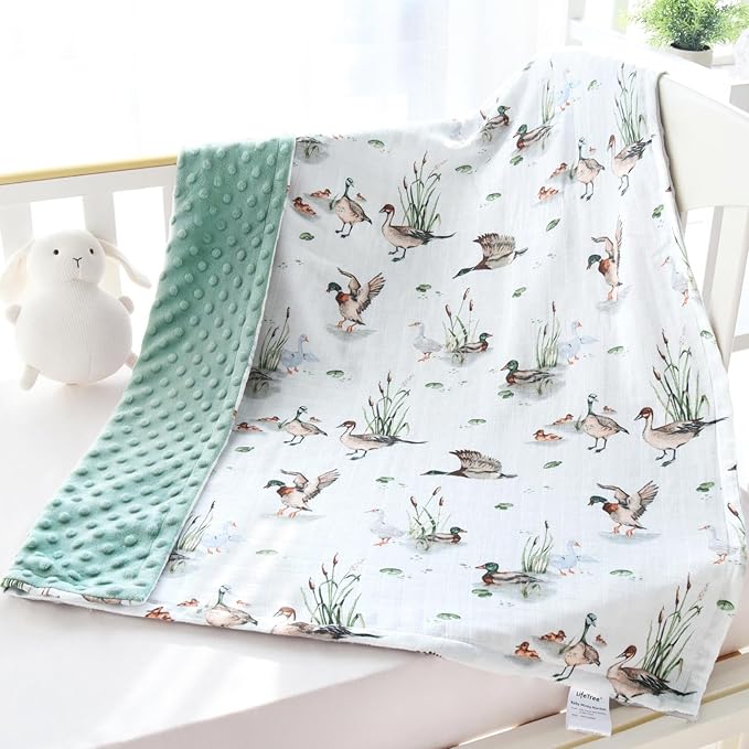 LifeTree Baby Blankets for Newborn, Soft & Lightweight Swaddle Blankets, Muslin Front and Dotted Fleece Backing Receiving Bed Blanket, 31X40 Inches, Baby Girl & Boy Blanket, Duck and Green
