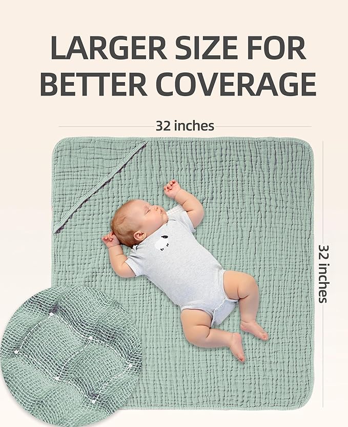 - Large 32x32 Inch Multi-Use Size:This large muslin hooded baby towel grows with your little one-from newborn to toddler-and also works as a baby blanket,stroller cover,or travel towel.