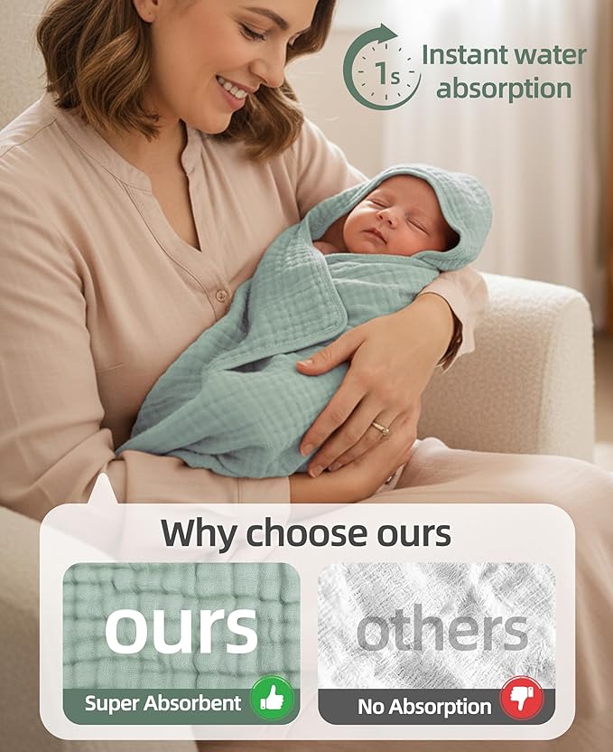 - 3-Pack Soft Muslin Cotton for Sensitive Skin:Made from 100% breathable muslin cotton,these 3-pack muslin baby towels are gentle,hypoallergenic,and the newborn essentials must-haves for delicate skin after every bath.