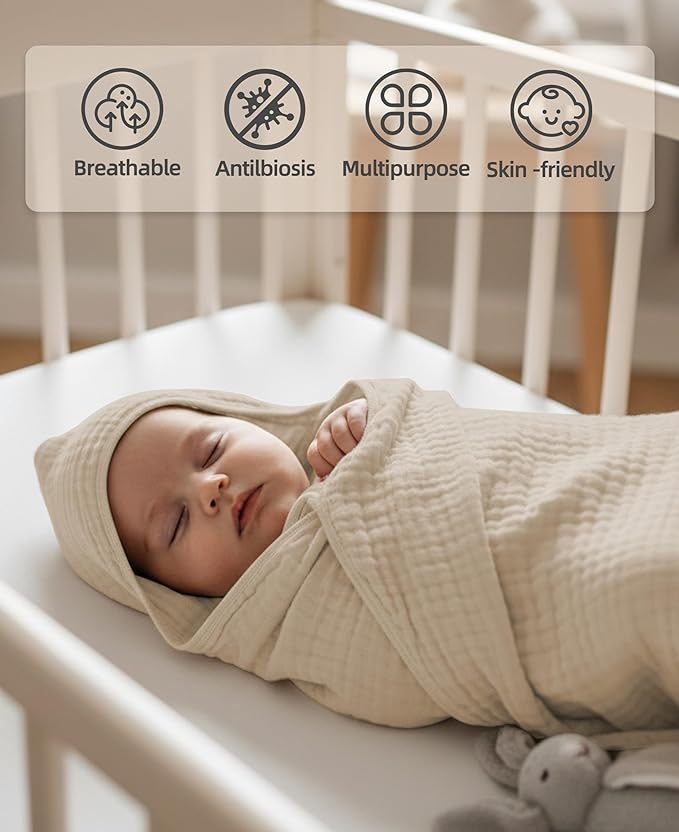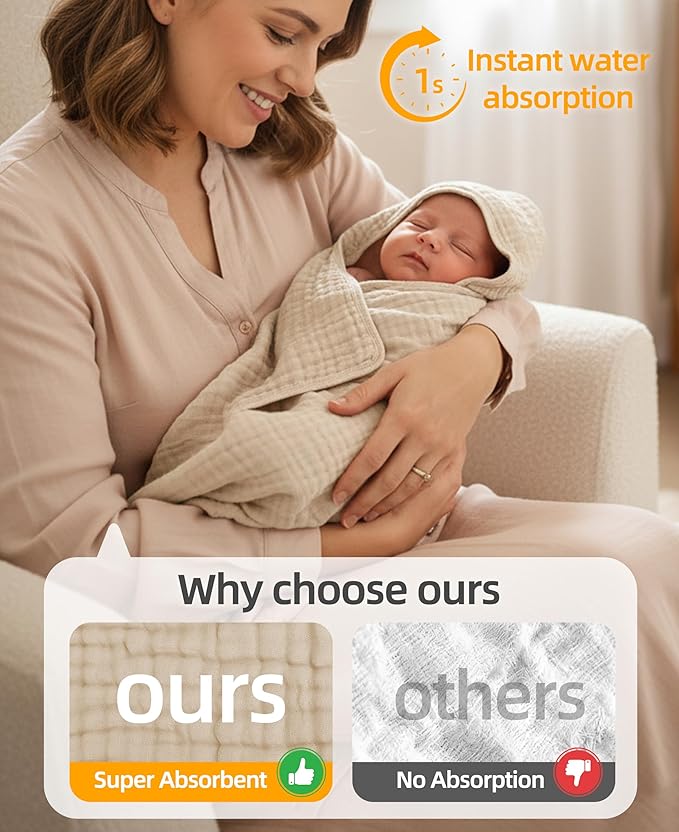 - 3-Pack Soft Muslin Cotton for Sensitive Skin:Made from 100% breathable muslin cotton,these 3-pack muslin baby towels are gentle,hypoallergenic,and the newborn essentials must-haves for delicate skin after every bath.