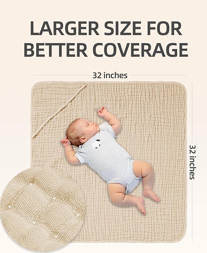 - Large 32x32 Inch Multi-Use Size:This large muslin hooded baby towel grows with your little one-from newborn to toddler-and also works as a baby blanket,stroller cover,or travel towel.