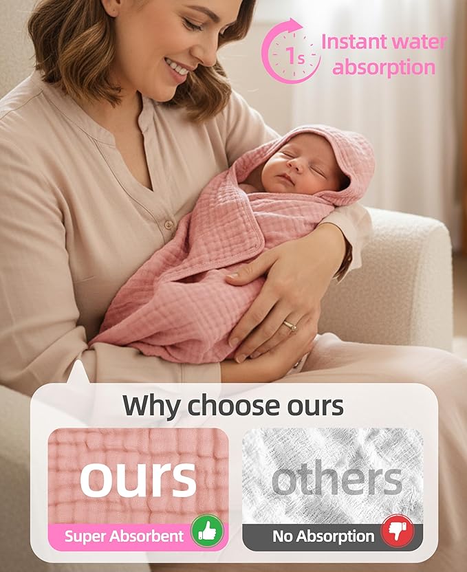 - 3-Pack Soft Muslin Cotton for Sensitive Skin:Made from 100% breathable muslin cotton,these 3-pack muslin baby towels are gentle,hypoallergenic,and the newborn essentials must-haves for delicate skin after every bath.