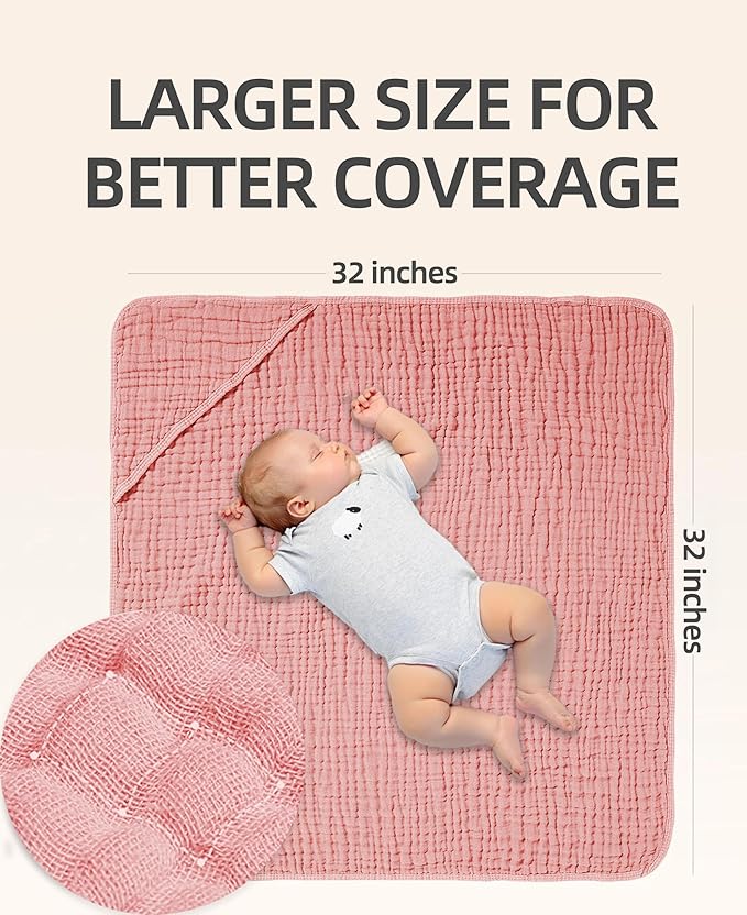 - Large 32x32 Inch Multi-Use Size:This large muslin hooded baby towel grows with your little one-from newborn to toddler-and also works as a baby blanket,stroller cover,or travel towel.