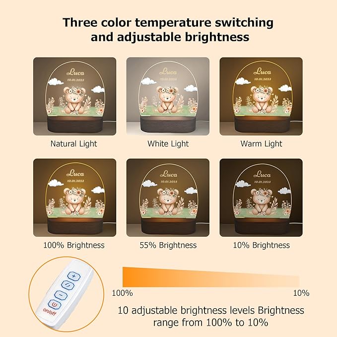 callie Acrylic Night Light Name Plate Personalized, Custom Cute Animal Dog Cat with Wooden Base Bedroom Decor, Birthday Gifts Kid Gifts for Family (Animal Bear Fox)