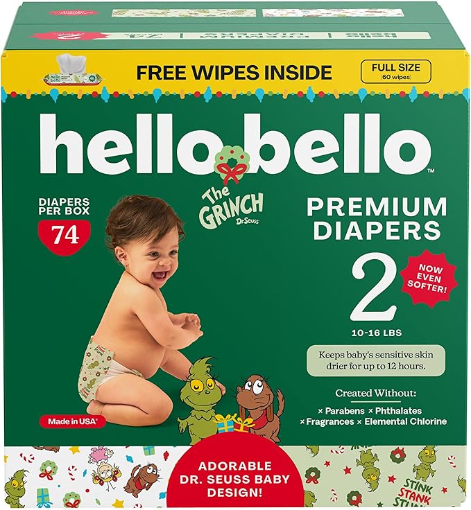 Hello Bello Dr. Seuss Baby Grinch Premium Diapers, Size 2 (10-16 lbs), 74ct Plus Bonus Wipes: Softness & Protection for Sensitive Skin