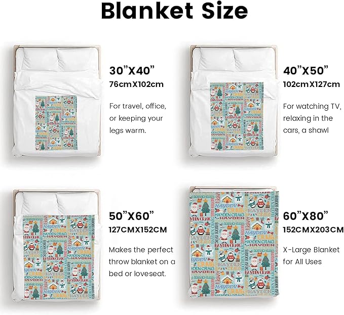 - š FOUR SIZES:This custom Christmas baby blanket is made of flannel fabric for a soft, comfortable feel. Hand or machine washable. Choose from four sizes: 30'' x 40" (infant), 40" x 50" (child), 50" x 60" (teen), 60" x 80" (adult).
